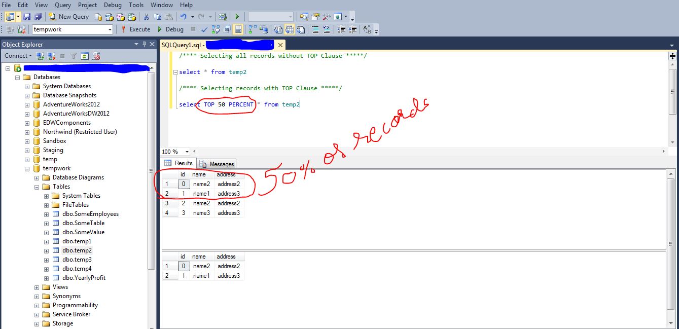 SELECT TOP 50 PERCENT * from [dbo].[tablename]